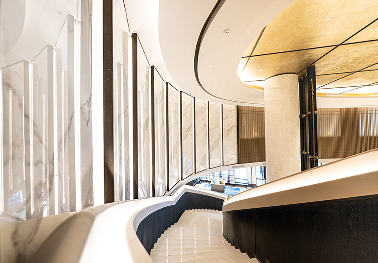 项目各个空间造型繁多、线条复杂,工期虽紧但无法批量生产部件,现场安装也要求十分精准。具备丰富施工经验的港源项目团队,在开工之前就协调各类材料厂家介入,共同讨论工艺做法,以充足的施工协调能力争取出大量的构件加工及精细施工时间。