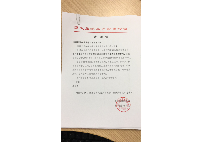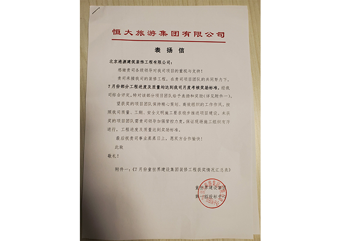 沧州恒大童世界表扬信