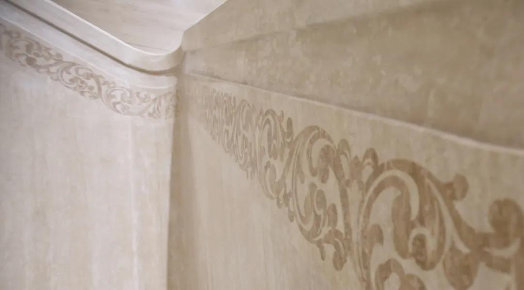 港源装饰把深、浅两色罗马洞石分别雕刻成形,再将深色石材花纹镶嵌进浅色石材扶梯中,随之加以精细打磨而成。