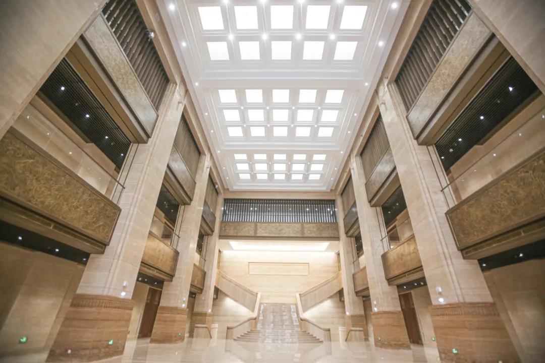 中国第一历史档案馆新馆室内精装涉及大量的、多种类型的石材拼贴。港源装饰项目团队凭借丰富的内装施工经验,提前制定完善的防范预案,