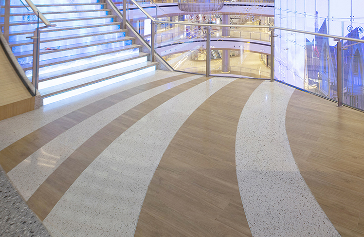 ↑每层楼梯口的地面拼花均由不规则的水磨石、木纹砖拼接而成,每块材质的造型及弧度都不相同,港源装饰项目团队采用碎片式拼接的精细施工方式解决此项难题。
