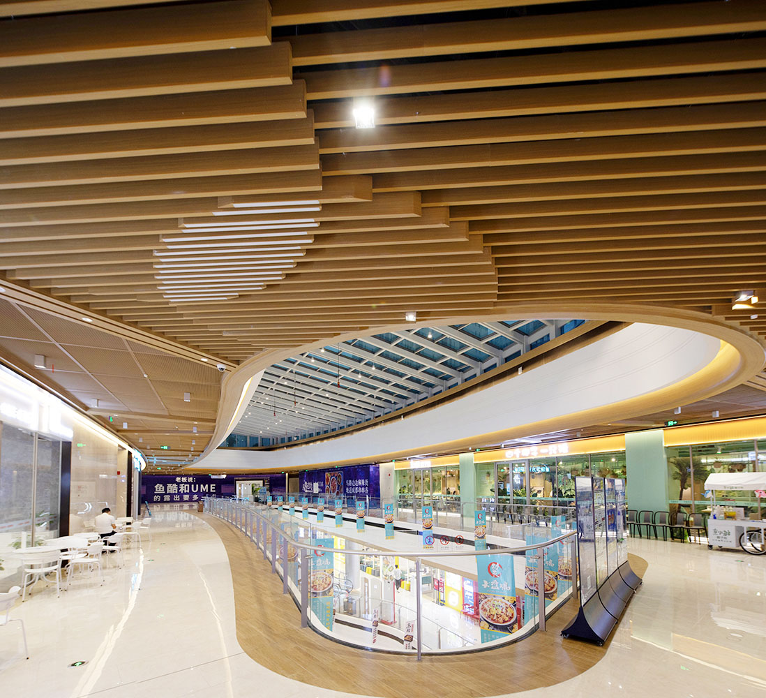 欢乐汇100FUN CITY购物中心室内设计极具韵律感,涉及大量弧形造型及复杂拼花。如要完美呈现项目设计初衷,港源装饰项目团队需持续解决多类材质拼接、大量异形造型加工等难题。这要求项目的深化设计、下单制作、现场加工必须十分精密、不失毫厘。