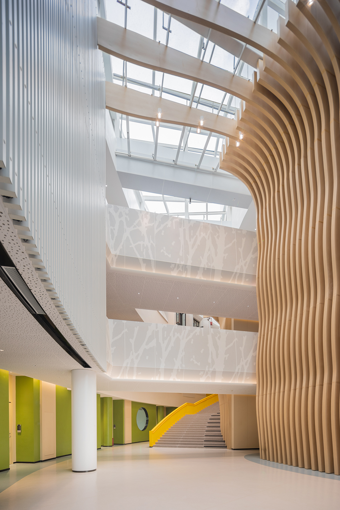博雅楼是亮亮中学的科技艺术区,室内设计及施工融合”景观+生态+文化”三大元素,特别是在中庭区域,“树状”造型包绕着整个墙面,充分展现了这座建筑的艺术沉浸感。但面对弧形的墙面、复杂的形态及高低起伏的楼梯,异形铝方通的下单制作及安装便成了整个区域一大难题。港源装饰项目团队以丰富的施工经验,充分考虑了铝方通重量及变形度,在现场对原设计图纸重新排版分段,反复精细测试,最终完美呈现出这片高达14米的树状造型。