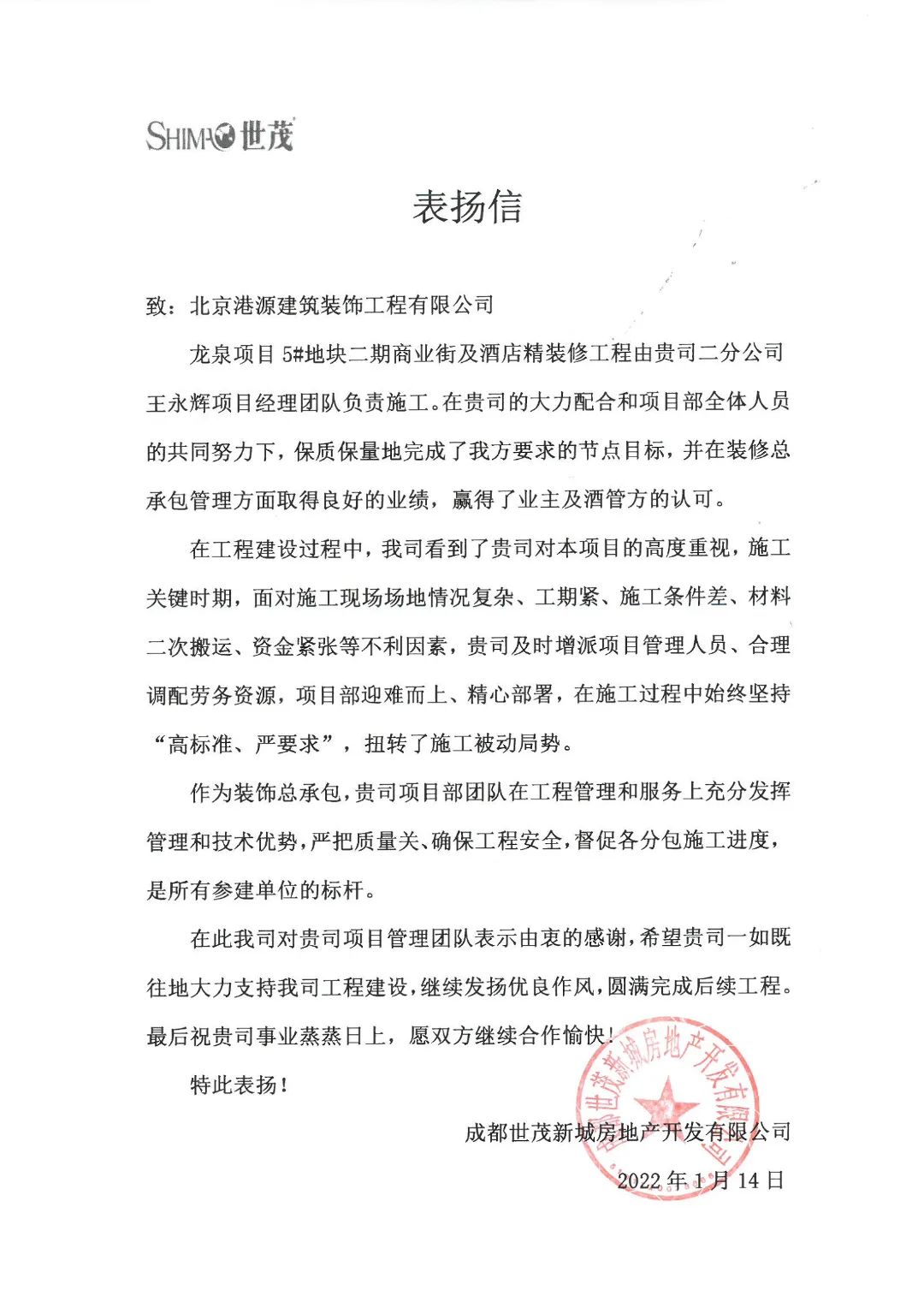 一封封表扬信、感谢信,是对港源品牌的认可,也是对全体项目管理人员付出的肯定,更是鞭策我们不断提高服务质量的动力。在今后的施工管理服务中,北京港源将坚持以“让客户更满意”为宗旨,以适应客户的多样化需求。
