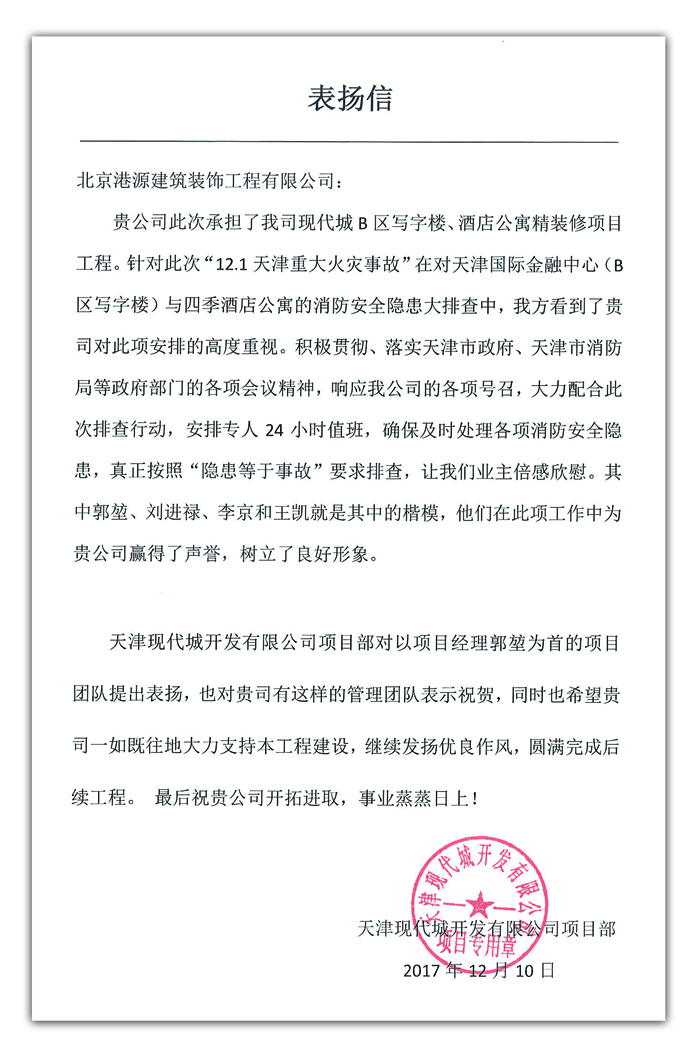 该项目由美国知名设计公司设计,是一个集超大国际购物中心、世界豪华五星级酒店、精装酒店式公寓、白金甲级写字楼及大型屋顶花园于一体的街区式城市综合体。港源装饰负责该项目写字楼、四季酒店公寓的室内精装修工程,作业面积达50000㎡,本工程以甲A级写字楼、高档酒店式公寓标准进行施工,所有作业及验收检测均按照高级装修标准要求完成。
